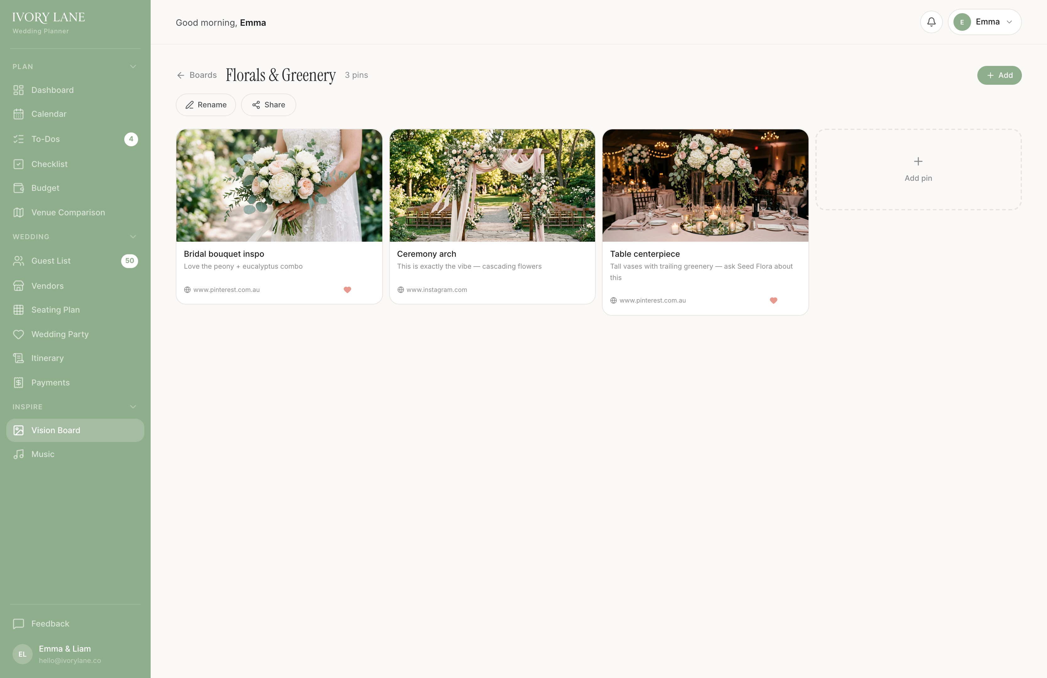 Pinterest-style boards for flowers, venues, decor, colour palettes — anything that inspires you. Favourite the best, share via link.