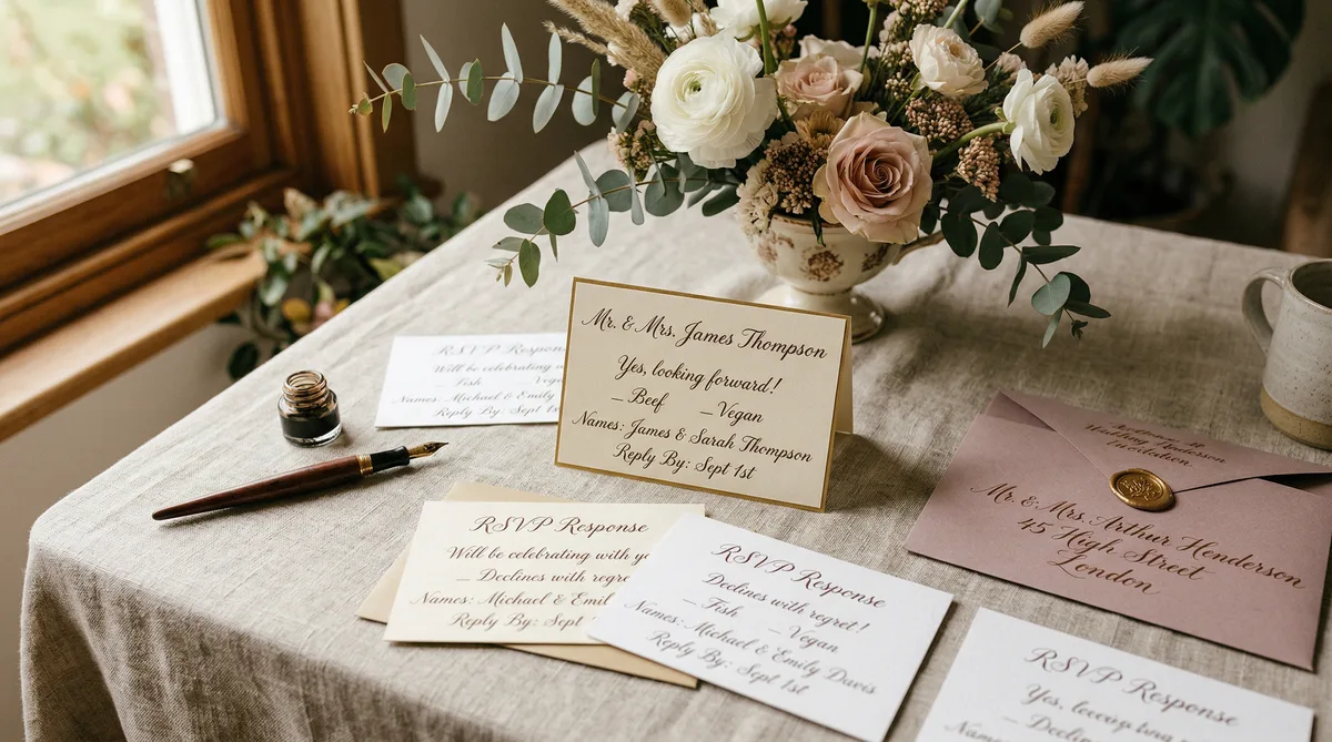 Most couples now use online RSVPs alongside or instead of physical cards. If you’re going digital, include the URL on a details card or the invitation itself.